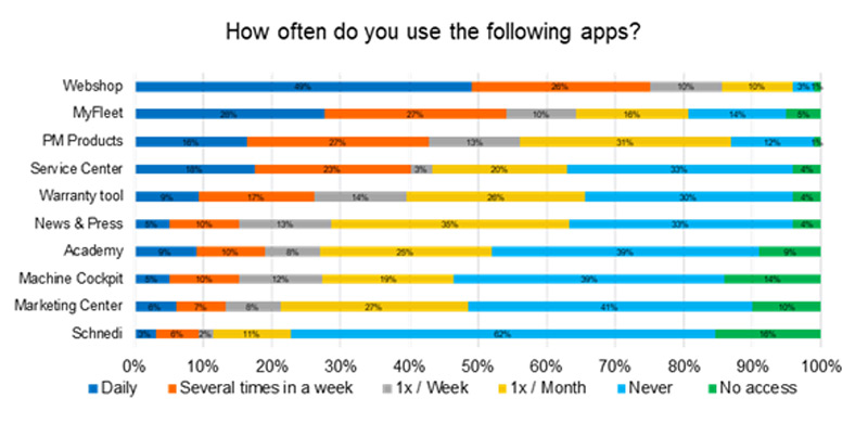 First of all, we’re very happy that the number of participants in the survey increases year by year. The vast majority of participants is using MY Putzmeister several times per week and overall, you are very happy with content and available features. Webshop, MY Fleet, PM Products and Service Center were ranked as the most important and most frequently used Apps.